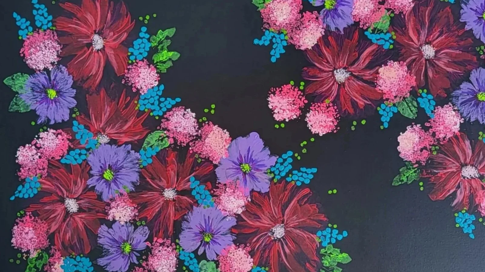 Großformatige Blumen entfalten sich auf der Leinwand in leuchtenden, kraftvollen Tönen.